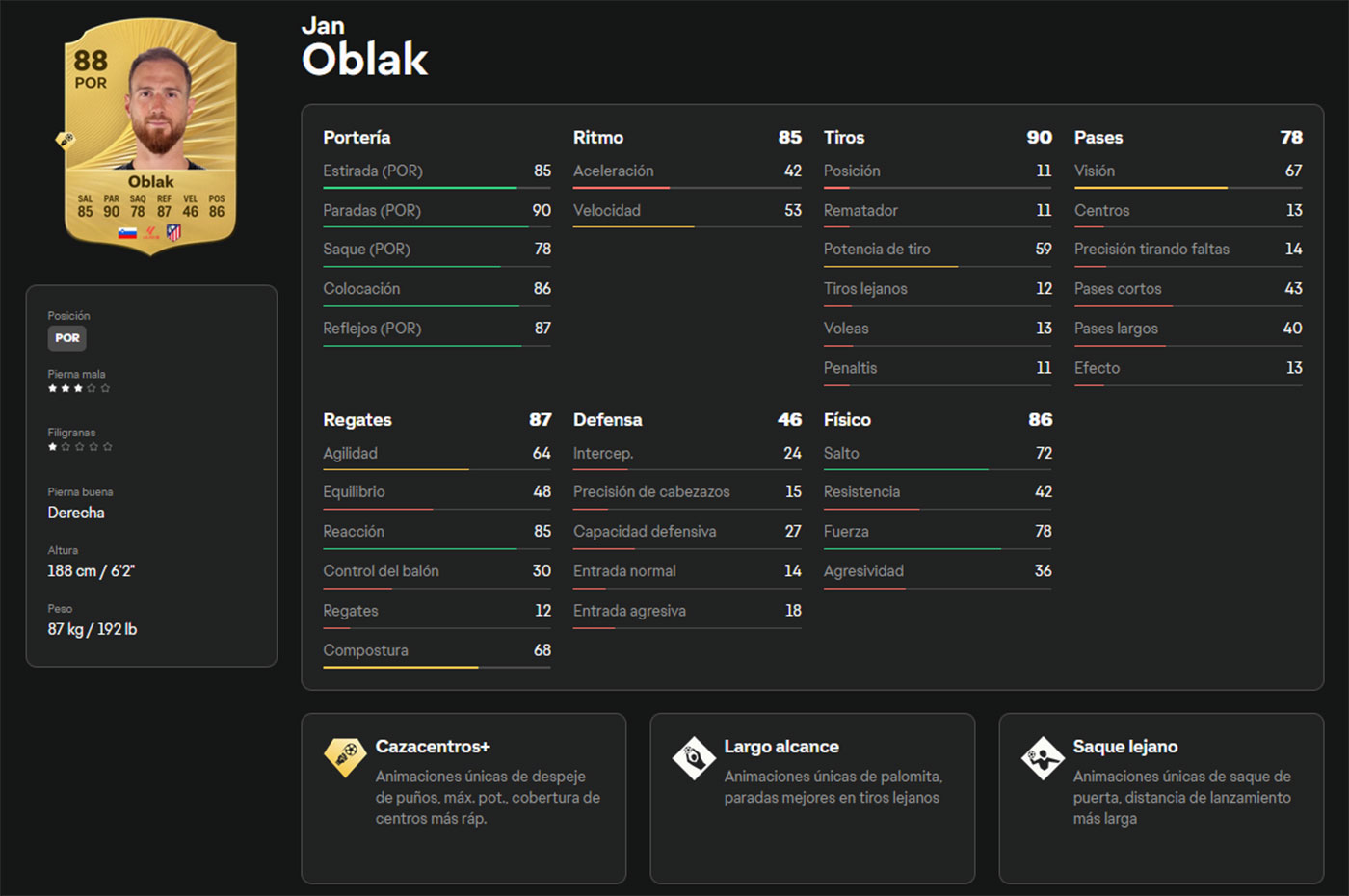 Aquí tenemos a un fijo de Simeone en el Atlético de Madrid y uno de los nombres más fiables en la posición. Su química puede ser un pequeño reto debido a su nacionalidad, pero la liga y el entrenador ayudan a resolverlo fácilmente. Oblak responde bien por alto y cuenta con PlayStyles muy útiles para la portería. Además, destaca por su saque largo y buen guante bajo palos, que aumentan su efectividad. Es un portero caro, pero la inversión merece la pena porque mantendrá la posición durante mucho tiempo, probablemente hasta que llegue el Equipo del Año.