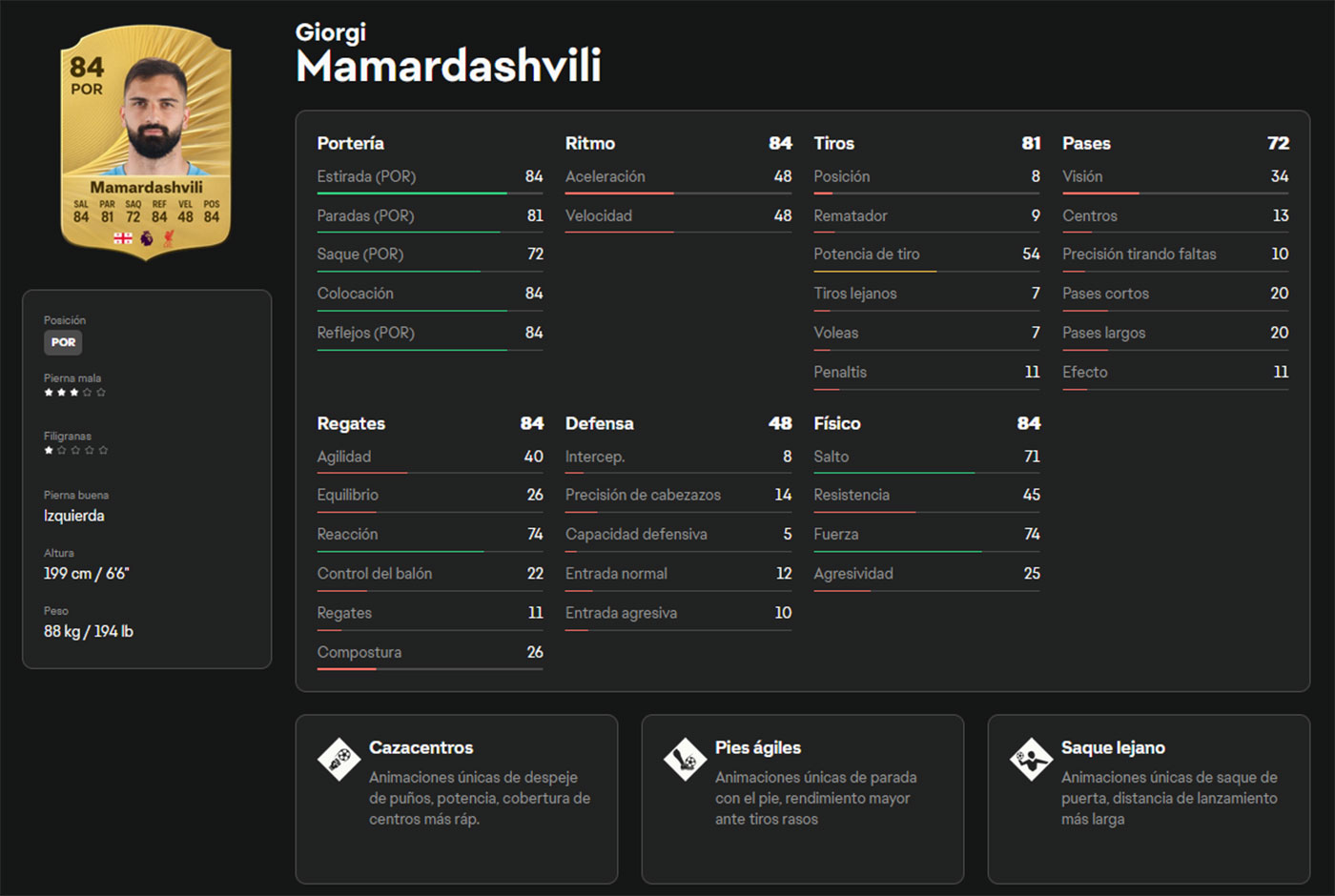 Si la idea es empezar con seguridad en la Premier League, Mamardashvili es un muro. Ex del Valencia y ahora en el Liverpool, mide casi dos metros y es un portero completo, con PlayStyles importantes. Por ejemplo, su saque largo facilita el contraataque, su juego de pies es útil contra disparos rasos y su salida aérea completa el conjunto. Sus tiempos de reacción transmiten confianza y, si consideramos su evolución, podría seguir siendo un jugador vital durante muchas semanas.