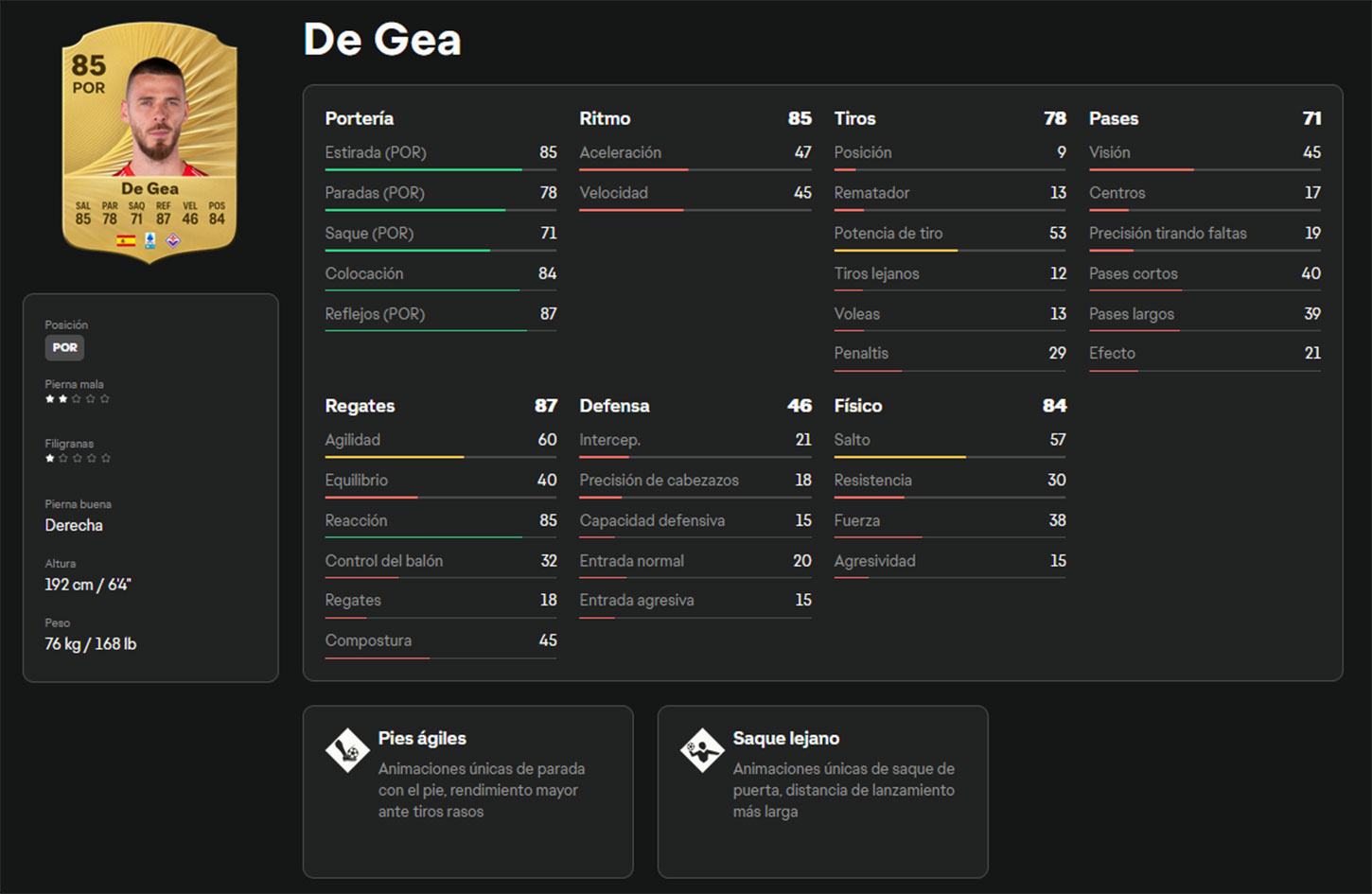 Otro que inspira confianza es De Gea, ahora una referencia en la Serie A. El ex del United impresiona con sus 1,92 m de altura y también presume de su talento bajo palos. Además, cuenta con dos PlayStyles muy útiles. Su saque largo es excelente para iniciar contraataques y su juego de pies es efectivo cuando el equipo se encuentra bajo presión. Es una opción segura y equilibrada si buscas estabilidad en la liga italiana.