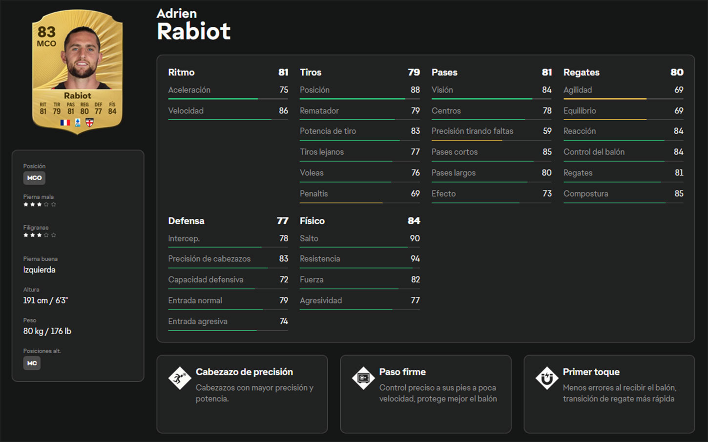 El francés Rabiot no falta a las grandes competiciones y mantiene su tradición de ser útil en FC 26. Puede jugar como centrocampista ofensivo y, en ese rol, llega desde segunda línea con criterio; si prefieres usarlo como MC, también tiene recorrido de área a área.