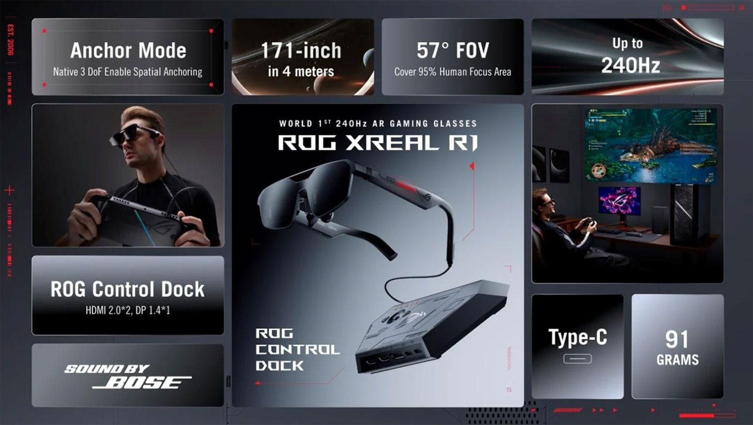 Con esta evidente estrategia de comunicación previa, ASUS ya ha presentado las ROG XREAL R1 Air como gafas de RA para jugar. Entre los datos que han circulado con su anuncio aparece una "pantalla" virtual de hasta 171 pulgadas, resolución 1080p y 240 Hz en panel micro-OLED, un ángulo de visión de 57 grados, audio 3D ofrecido por tecnologías Bose y Conectividad USB Tipo-C, además de otras funciones pensadas para este formato recogidas en tan solo 91 gramos de peso. Seguro que ambas empresas irán ampliando información próximamente.