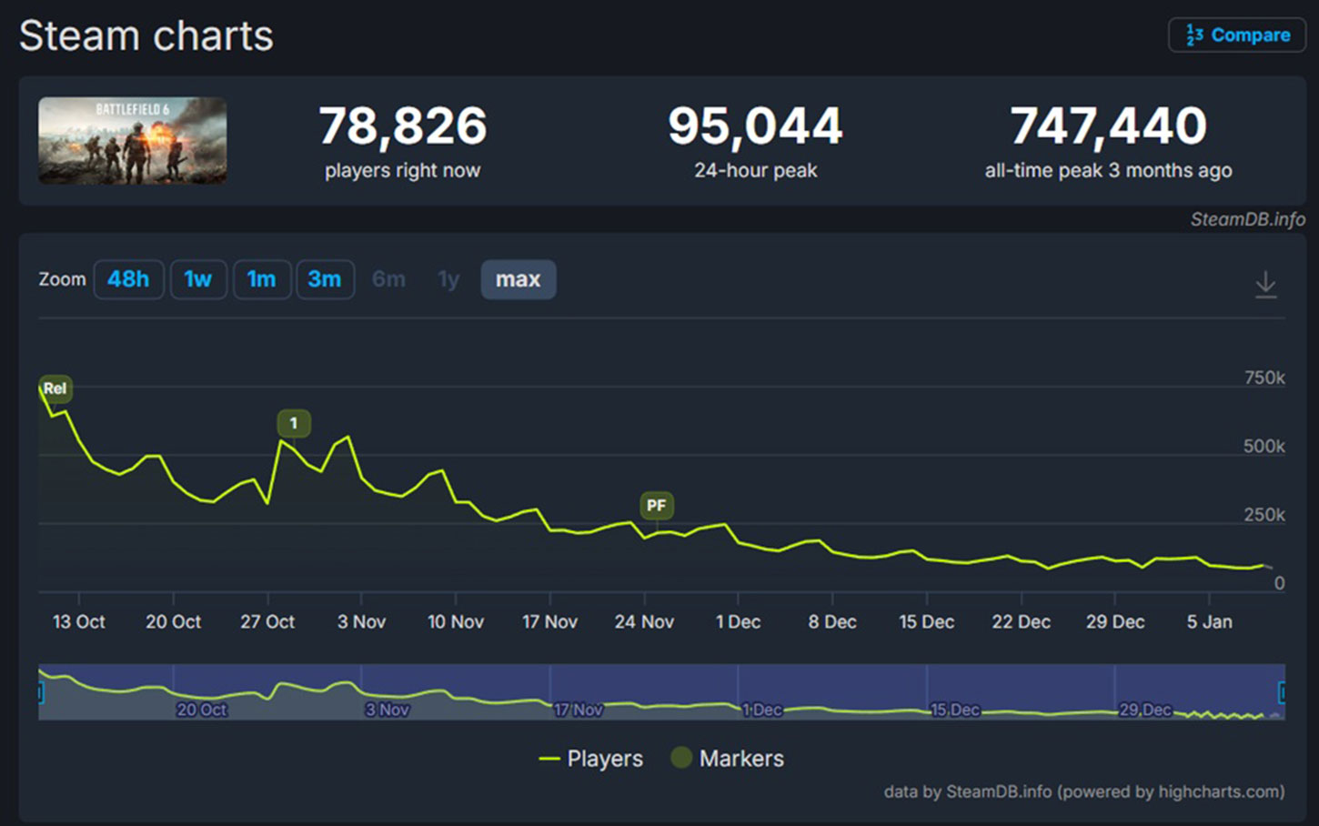 Con todo, atendiendo estrictamente a las cifras, ‘Battlefield 6’ celebró un enorme debut en octubre, luego sufrió un primer bajón, volvió a repuntar a finales de ese mes y principios de noviembre, pero desde entonces se ha mantenido en una línea descendente, mientras que las reseñas recientes "Mixtas" proliferan en la plataforma, con una reducción hasta el 52 por ciento de valoraciones positivas en los últimos 30 días.