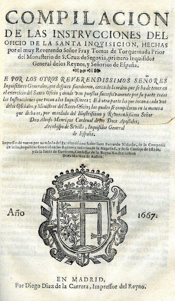 Este importantísimo establecimiento se debe atribuir particularmente a la Reina Católica doña Isabel, y al influjo del gran Barón Fr. Tomás de Torquemada, del Orden de Predicadores, y Confesor de dicha Reina Doña Isabel desde que era Princesa en tiempo de su hermano Don Enrique el IV; el cual, viendo las ofensas de Dios, conjuró a la Princesa en nombre del Señor, a que si Dios la ensalzaba al Trono, tomaría por su cuenta el perseguir en sus estados los delitos contra la Fe, como lo verificó, instituyendo luego que entró a reinar el santo Tribunal de la Inquisición, y eligiendo por primer Inquisidor General al mismo Torquemada, protegido del gran Cardenal Arzobispo de Sevilla, principal móvil de esta obra. Y así con justa razón la Orden de Santo Domingo se puede gloriar de ser como la fundadora de este establecimiento en España…