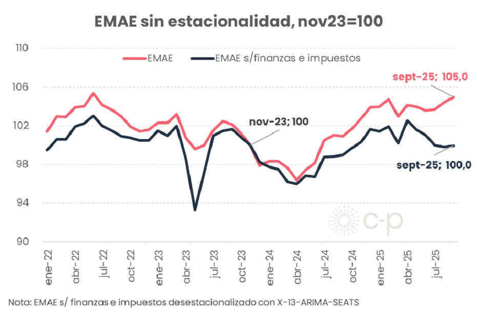 Al respecto, según Diego Giacomini "de acuerdo con el EMAE del INDEC, el 64% del crecimiento interanual (5%) se debe a que el Estado le cobra más impuestos a los privados devolviéndoles menos subsidios (37p.p) y que los bancos (27p.p.) cobran mayor tasa de interés también a los privados". En definitiva, el crecimiento interanual del 5% se debería solo a "especulación financiera". C-P Consultora publicó que "sacando intermediación financiera e impuestos netos de subsidios, el EMAE estaría en los mismos niveles de nov-23. El gráfico muestra su influencia sobre la dinámica general":