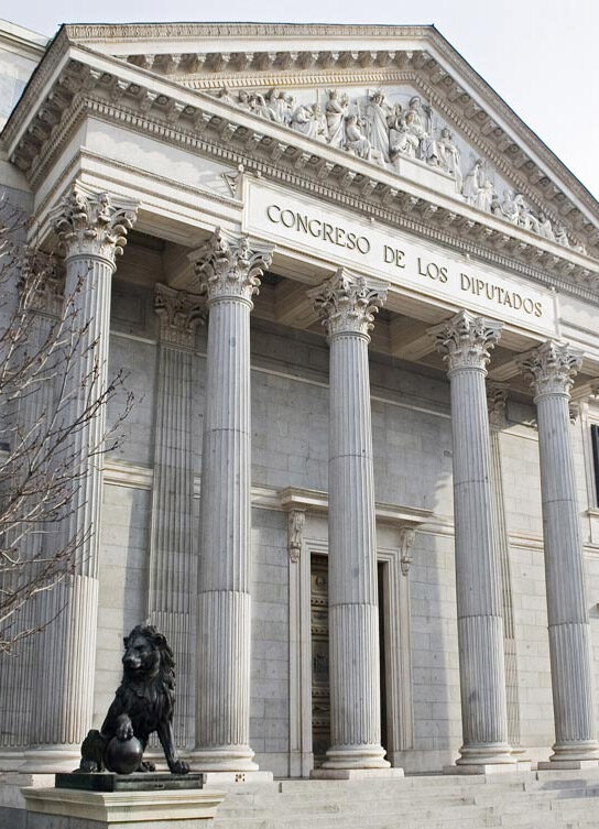 El Convento del Espíritu Santo, de padres clérigos menores, había sido fundado en 1594. En 1816, el arquitecto Manuel de la Peña y Padura había modernizado su fachada, levantando una portada de orden jónico entre dos torres coronadas por chapiteles típicamente madrileños; pero unos años más tarde, en 1823, mientras oía misa allí el Duque de Angulema (jefe de la expedición de los Cien Mil Hijos de San Luis), se desató un devastador incendio que arruinó el edificio. Los frailes tuvieron que trasladarse y el inmueble quedó vacío, hasta que una comisión designada al efecto lo recomendó para albergar a los procuradores previstos en el Estatuto Real. Con el incendio habían caído las torres de Manuel de la Peña, y en su lugar se había erigido una fachada modesta, de gusto neoclásico, guardada ya por dos leones sobre pedestales. Con ello se había procurado disimular los estragos del fuego, pero en 1841 debió declararse el estado ruinoso del inmueble y los procuradores se trasladaron al Teatro Real o de Oriente, que desde 1818 se edificaba donde había estado el viejo Teatro de los Caños del Peral. Allí, en el salón de baile, se celebraron los plenos hasta 1850, cuando no sólo acabaron las obras del propio teatro, sino las del edificio proyectado para sede de las Cortes tras la demolición, al efecto, del Convento del Espíritu Santo. Esta comenzó el 21 de marzo de 1842.