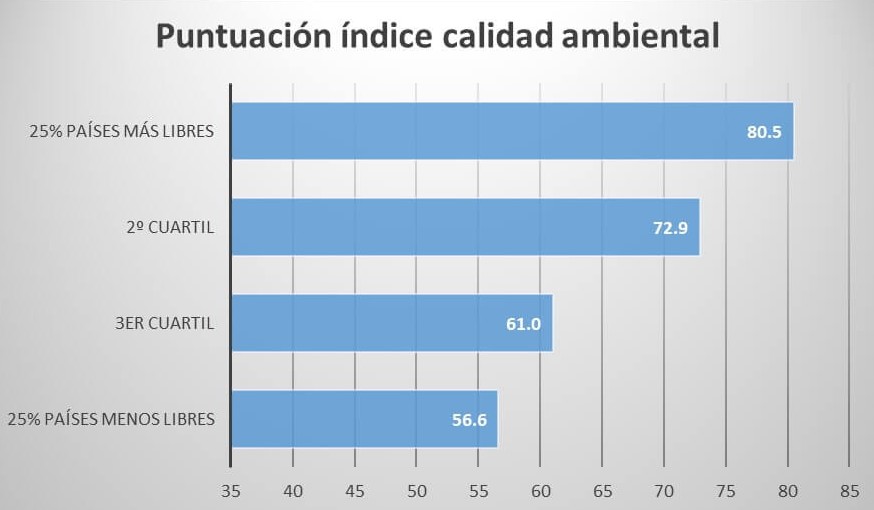 Tal y como demostró el economista Daniel Fernández, si ordenamos los países de más a menos libres (por cuartiles) vemos cómo, efectivamente, aquellos con mayor puntuación en el índice de libertad económica son también los más verdes desde el punto de vista ambiental.