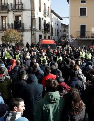 En medio de la tensión reinante en la Plaza de los Fueros, acordonada por la Guardia Civil y aromatizada por el estiércol acopiado por los lugareños, los discursos de quienes tomaron la palabra, entre ellos, el de Fernando Savater y el de la víctima de ETA, Beatriz Sánchez Seco, tuvieron como fondo el ruino de sirenas e insultos. La berrea abertzale estuvo, además, acompañada por una lluvia de mecheros y piedras. Un último elemento completó la escena, el continuo repiqueteo de las campanas de la Iglesia de Nuestra Señora de la Asunción, hecho que llamó poderosamente la atención, pues las relaciones entre la Iglesia vascongada, pero también la navarra, con los movimientos separatistas más o menos violentos, son un clásico. Si el sabotaje callejero es una constante en este tipo de actos, el tañido del bronce ha dado lugar a múltiples reacciones, máxime después de que la parroquia hiciera público un comunicado, de exquisita y equidistante redacción, en el que se desmarcaba del bandeo de las campanas. La calculada nota lamentaba "la utilización de la iglesia para fines al margen de su misión pastoral", y descargaba toda la responsabilidad de lo ocurrido en la actuación de unos jóvenes que, "por la escalera del coro han accedido al campanario, sin conocimiento de los sacerdotes de la parroquia, que estaban en la sacristía". La polémica no cesó con la emisión del texto, pues el cura Francisco Javier Izco, en el curso de una entrevista radiofónica realizada por Dieter Brandau, exhibió lo que sólo gracias a un excesivo ejercicio de generosidad, cabe calificar como cautelas, en relación a la actitud que la Iglesia española mantiene en las regiones donde el separatismo a punto está de salir bajo palio.