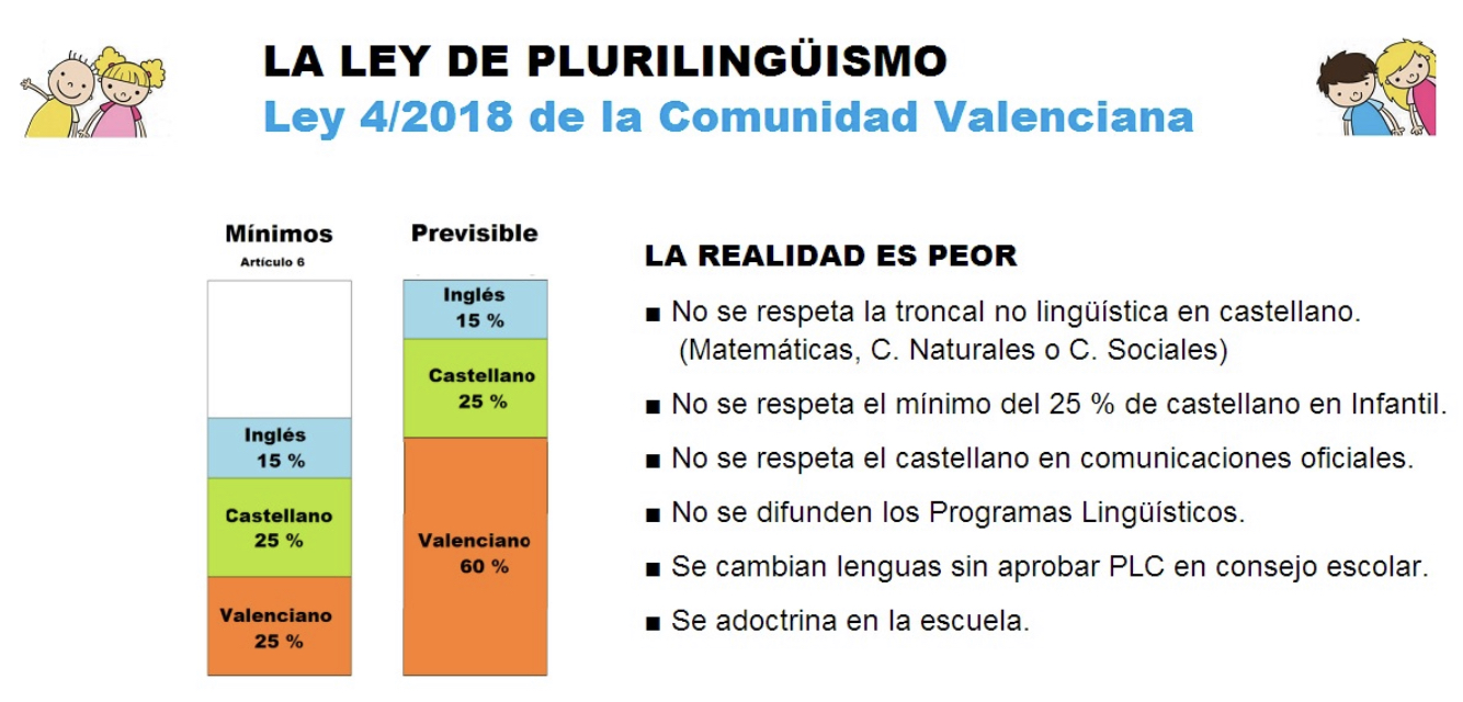 La imposición lingüística en educación viene marcada en esta comunidad por la Ley 4/2018 de plurilingüismo. Se basa en establecer lenguas vehiculares en las materias educativas, con un mínimo del 25 % en español y un 25 % en valenciano. Otro aspecto importante en la ley valenciana es que ambas lenguas, español y valenciano, deben vehicular, al menos, una materia troncal no lingüística. En primaria las troncales no lingüísticas son: Matemáticas, Ciencias Naturales y Ciencias Sociales. En secundaria y bachillerato son muchas más.