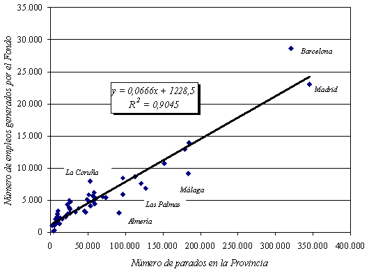 Lo primero que conviene señalar a este respecto es que, aparentemente, la distribución del fondo en proporción a la población de cada ayuntamiento resulta razonable. En el Gráfico 1 se muestra, con una agregación provincial, la ubicación geográfica del desempleo y de los puestos de trabajo que se atribuyen al FIEL. La relación entre ambas variables es evidente –pues el paro es numéricamente más grande en las provincias más pobladas–, y ello se refleja en el elevado valor del coeficiente de determinación (R2) del ajuste de regresión entre ellas –que señala que, en un 90 por 100, el reparto de los empleos del FIEL se asocia con el número de parados provinciales–. Aun así, se dan diferencias en el tratamiento de las provincias, como puede verse en los casos de Barcelona y Madrid: aquélla, con menos parados que ésta, cuenta con un número apreciablemente mayor de puestos de trabajo atribuibles al FIEL. En el gráfico se singularizan las provincias en las que, de acuerdo con esta comparación, los municipios sacan más ventaja –como Barcelona y La Coruña, que quedan por encima de la recta de regresión– o, por el contrario, están en desventaja –como Málaga, Las Palmas y Almería, que se sitúan por debajo–.