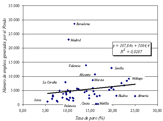Pero que haya, en términos absolutos, más parados en las provincias más pobladas no significa que el desempleo sea un problema de mayor envergadura allí donde vive más gente. Una visión simplista como esa oculta que las oportunidades de trabajo se distribuyen por la geografía de una forma bien distinta, lo que hace que la probabilidad de estar parado no dependa del tamaño de la población. Esa probabilidad se expresa en la tasa de paro –que señala el número de desempleados por cada cien personas activas, que trabajan o desean trabajar–. Si se pone en relación la generación de puestos de trabajo por parte del FIEL con la tasa de paro de cada provincia –tal como se muestra en el Gráfico 2–, entonces se aprecia que el criterio empleado para repartir los recursos de aquél no guarda relación alguna con la intensidad con que se manifiesta el problema del paro. En efecto, la recta de regresión ajustada entre esas variables muestra un coeficiente de determinación (R2) muy bajo, de modo que sólo un 2,8 por 100 de esos puestos de trabajo se explica por el nivel relativo del paro. A título indicativo, el gráfico muestra que Barcelona y Madrid, con una tasa de paro similar a la de Palencia, obtienen del fondo muchos más empleos que esta última. Lo mismo ocurre si se compara Alicante y Murcia con Ceuta y Melilla, o Sevilla con Huelva, o Málaga con Almería, y así sucesivamente.