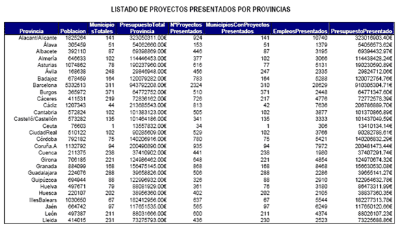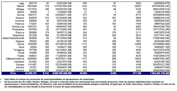 [1] En el Apéndice 1, tomado del MAP, se ha deslizado un pequeño error en la suma de los presupuestos y de los empleos. Por otra parte, hay 212 proyectos adicionales presentados mancomunadamente que no se han reflejado en el Apéndice.