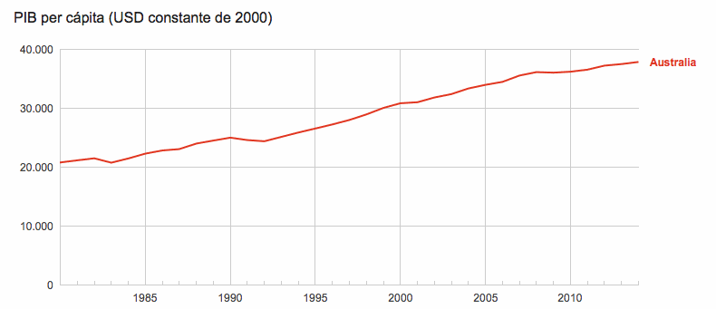 ¿El resultado? El PIB per cápita ha crecido espectacularmente conforme Australia ha girado hacia un modelo liberal. Si a comienzos de la década de 1980 apenas alcanzaba los 20.000 dólares, en 2014 rondaba los 40.000 dólares.