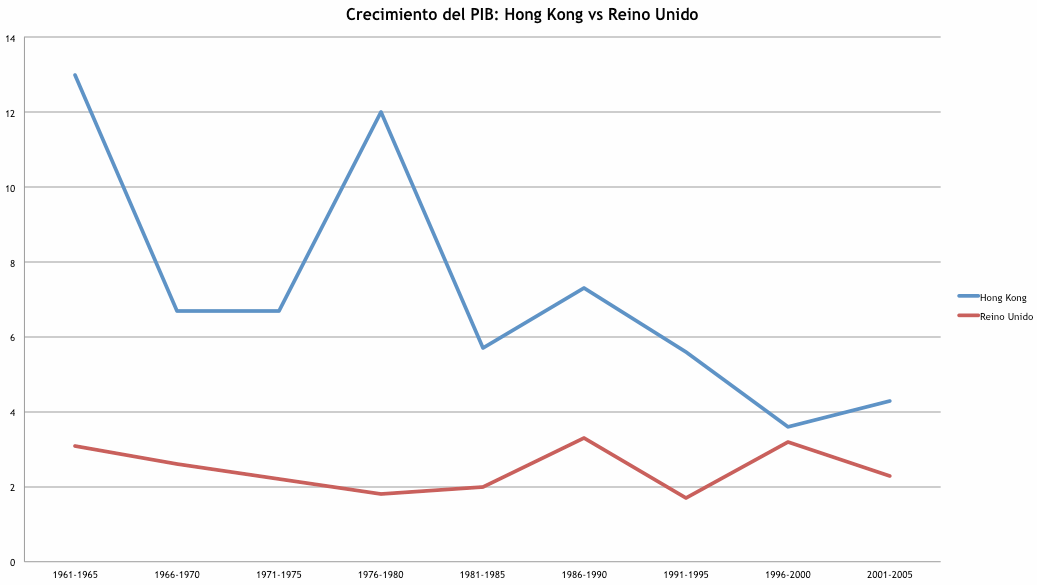 Por ejemplo, el crecimiento por lustro del PIB de Hong Kong ha superado a Reino Unido en todo el periodo que va de 1960 a 2005. De media, la isla ha aumentado el PIB a un ritmo del 7,2% que supera holgadamente el 2,5% registrado en Reino Unido.