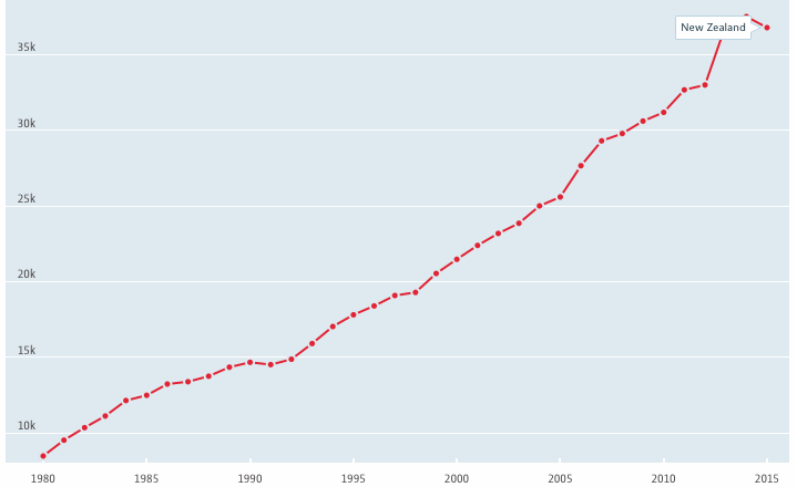 El PIB per cápita de Nueva Zelanda se disparó de 8.000 a 35.000 dólares entre 1980 y 2015.