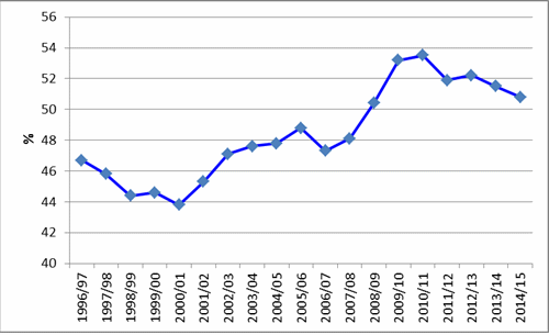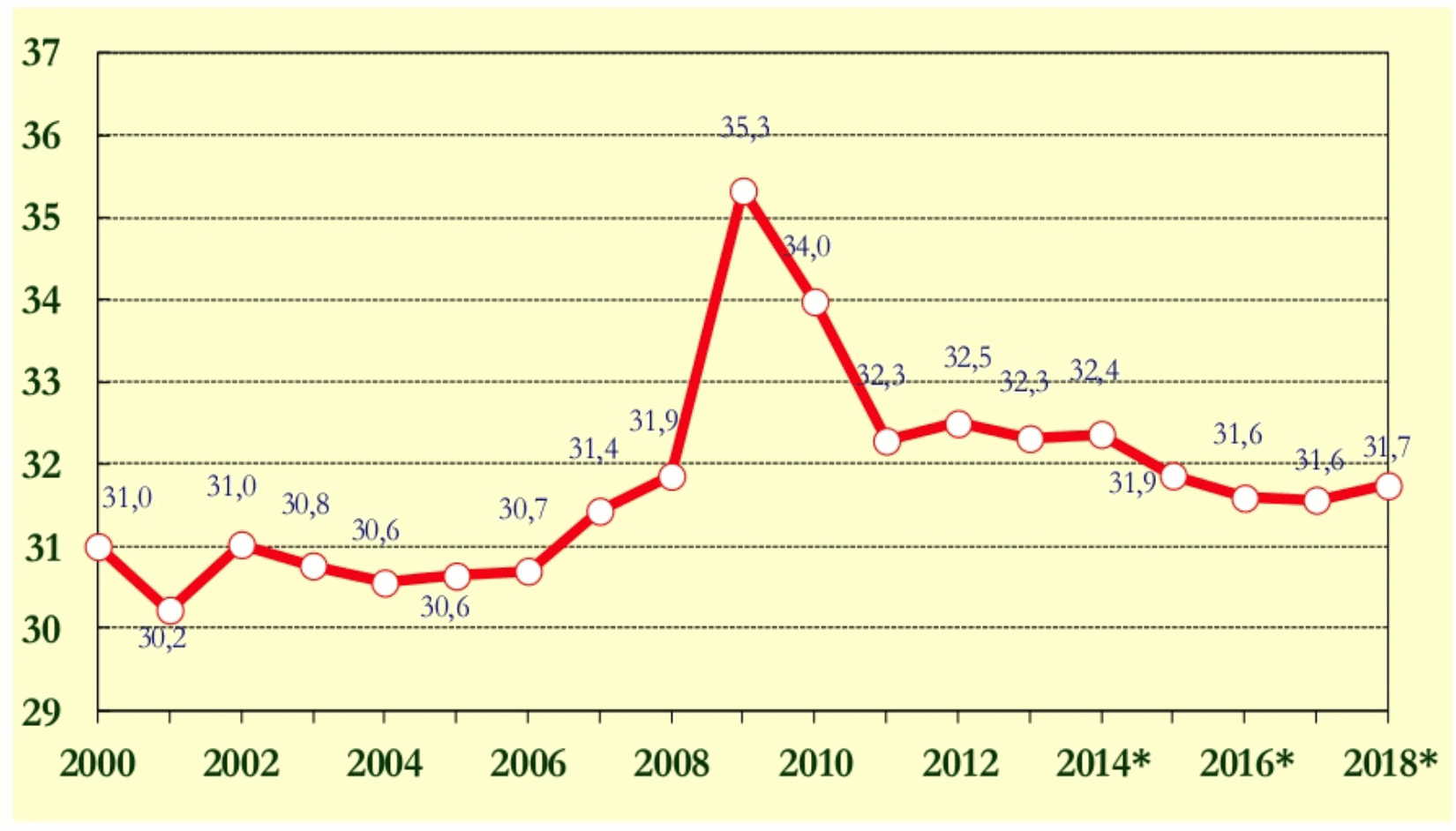 A lo largo de este periodo, el gasto público ha caído de manera sistemática, pasando del 42% del PIB en 1985 al 35% del PIB en 2015. Algo similar ha ocurrido con la presión fiscal, que tocó techo en 1991, cuando se alcanzaron niveles del 42% del PIB. Desde entonces, la recaudación tributaria ha perdido peso hasta llegar al 35% del PIB registrado en 2015.