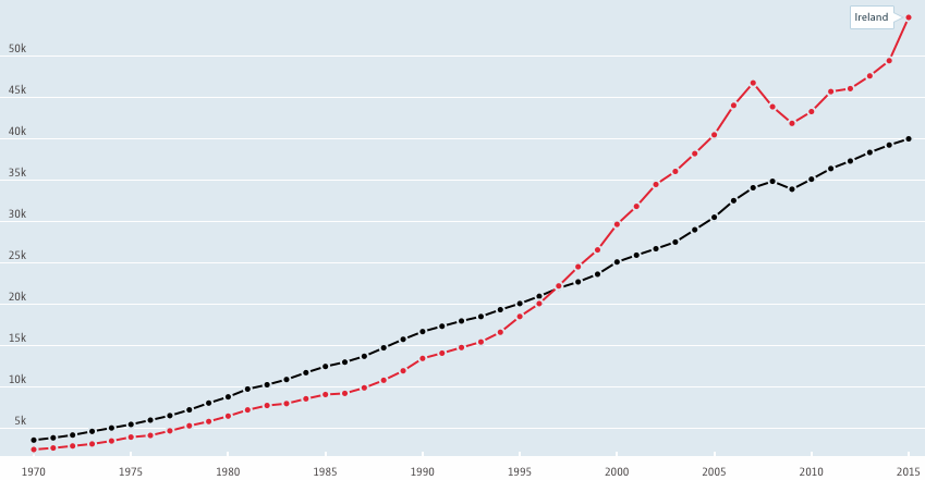 El paro en Irlanda es del 11,6% y el PIB per cápita es de 43.510 euros. La economía experimentó un espectacular aumento de la actividad en los años que siguieron a la crisis y, de hecho, el crecimiento en 2015 alcanzó el 26%, una cifra récord.