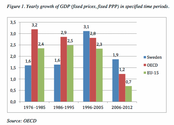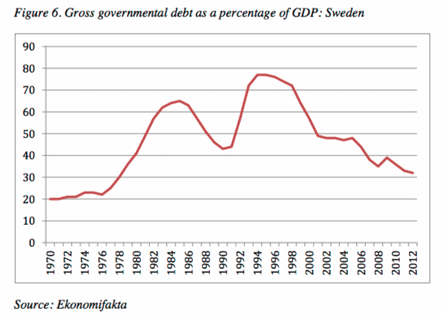 A mediados de la década de 1990, la deuda pública sueca rondaba el 70% del PIB. Sin embargo, en el año 2000 ya había caído al 51,3% y en 2015, a pesar de la crisis, había seguido cayendo hasta situarse en el 44,1%. La proyección a medio plazo es positiva y está previsto que el endeudamiento caiga al 38,9% del PIB antes de 2020.