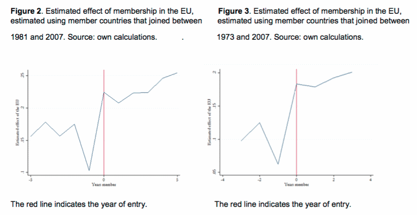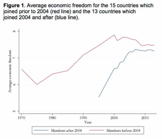 Según el estudio de EPiCENTER, "un análisis econométrico de la evolución de los países miembros en el Índice de Libertad Económica apunta que formar parte de la UE va de la mano con un aumento de la libertad económica". Los resultados están controlados, para aislar posibles distorsiones (crecimiento del PIB, grado de democratización…), y arrojan conclusiones que el autor define como estadísticamente significativas.