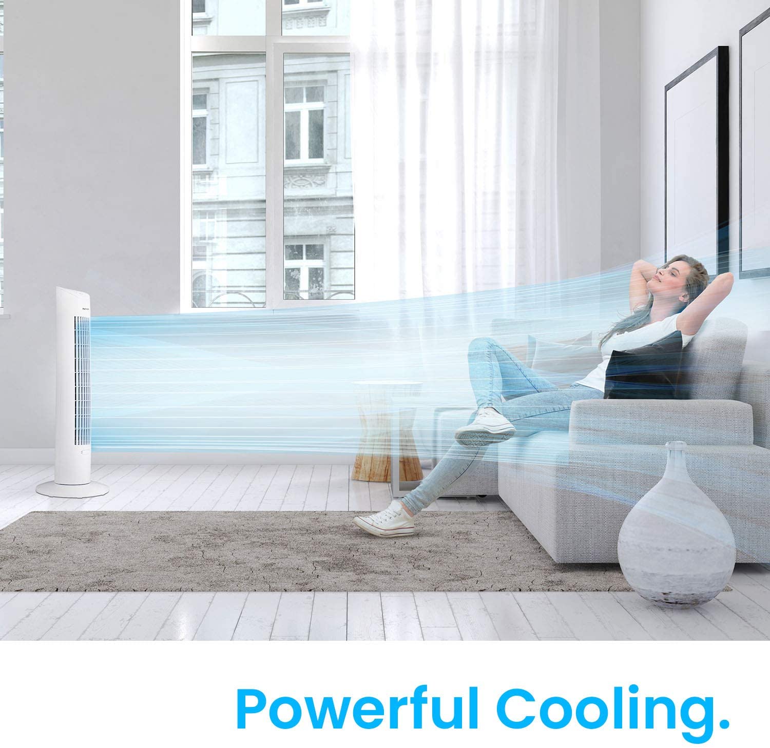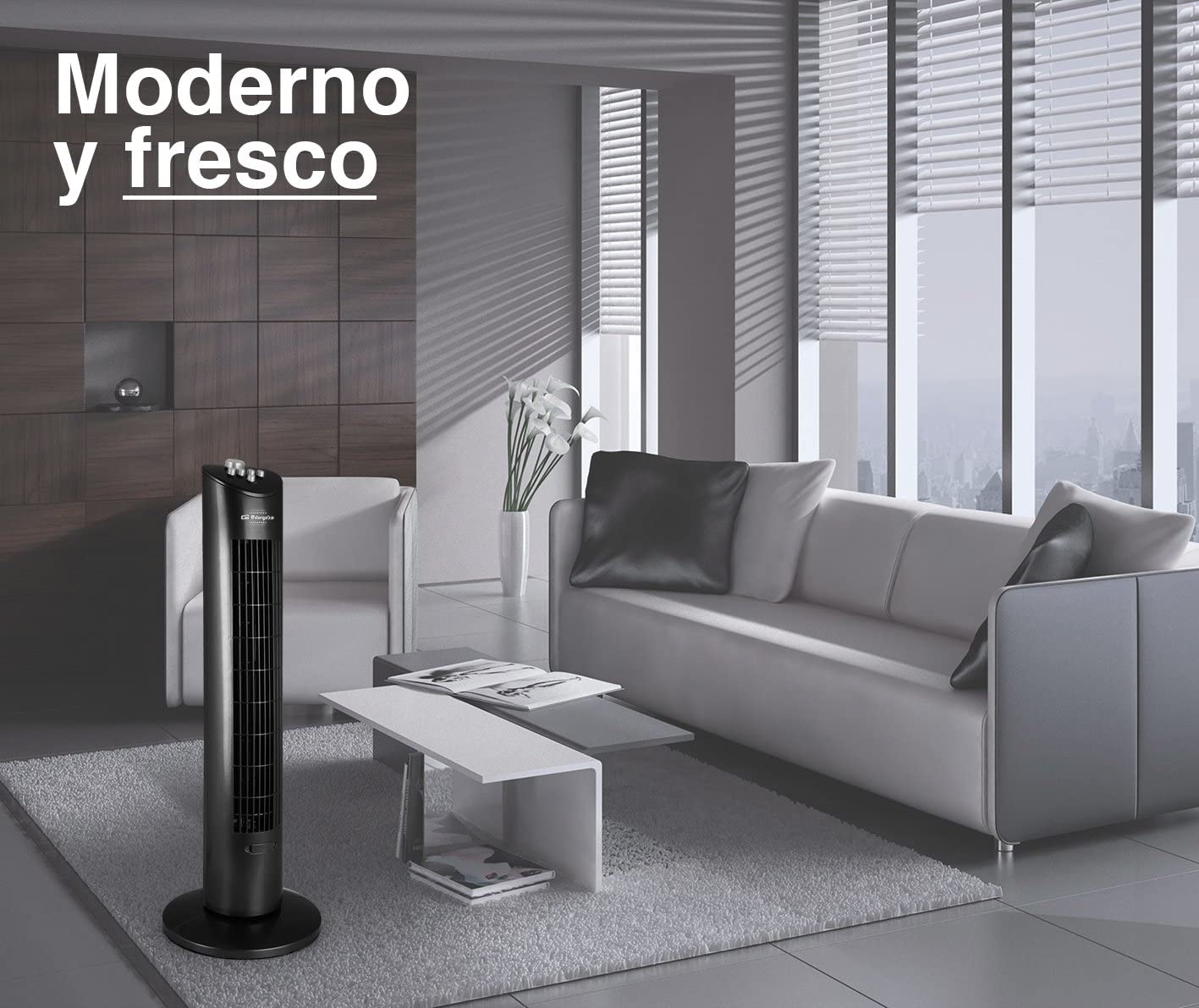 No cabe duda de que este es un ventilador de torre de alta capacidad, que permitirá tener tus espacios frescos gracias a sus 60W de potencia. Ofrece una oscilación automática de 70 grados, lo que te permitirá enviar grandes zonas de tu hogar de una forma realmente sencilla, y con sus 3 velocidades será muy fácil de graduarlo.