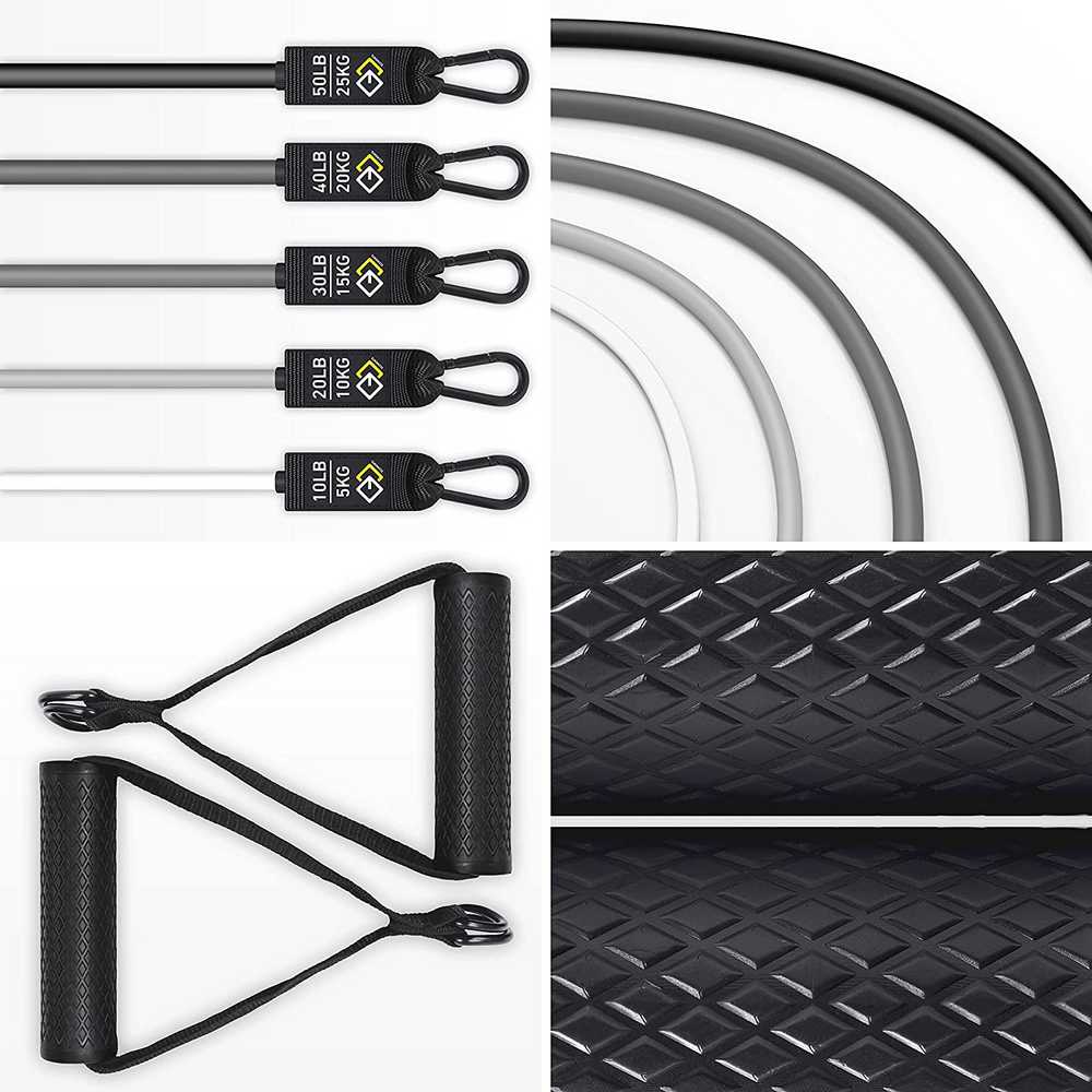 Se trata de unas bandas elásticas que tienen una gran resistencia y que pueden llegar a brindar una resistencia de hasta 150LBS si se utilizan combinadas. Están fabricadas en látex de alta calidad, que le confiere una gran elasticidad y una gran resistencia al desgaste por lo que durarán mucho tiempo. Vienen con correas de tobillo suaves y resistentes y con asas acolchadas y antideslizantes.