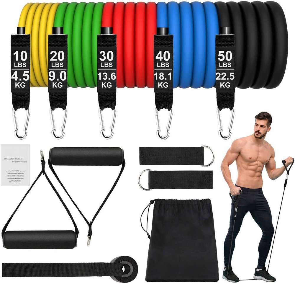 Este es un juego de cuerdas tensoras para musculación que consta de 11 piezas para un entrenamiento que sea altamente efectivo. Se pueden utilizar combinadas de diferentes formas, con lo que puedes tener una resistencia de hasta 110 libras si las combinas todas. Pueden utilizarse para diferentes tipos de ejercicios, siendo perfectas para cualquier tipo de ejercicios con una resistencia óptima.