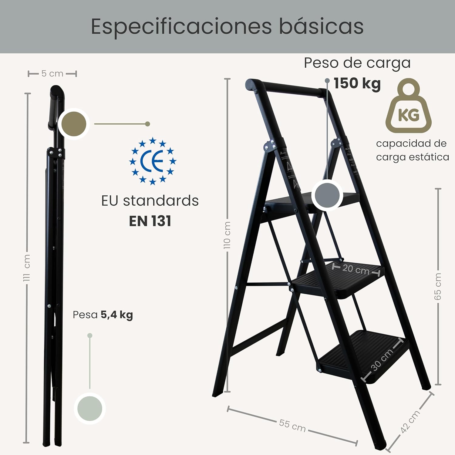 Certificación EN131: garantiza seguridad y resistencia hasta 150 kg.