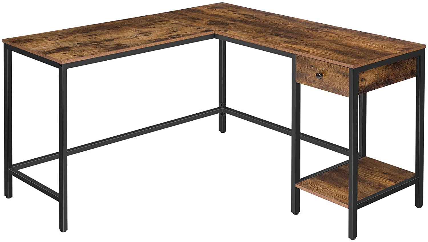 Es una mesa de ordenador para casa que viene con un diseño clásico de madera, y que cuenta con una estructura metálica muy resistente. Tiene una forma de L, lo que permite que se puedan colocar 2 ordenadores y que puedas tener una gran superficie de trabajo. También viene con dos estantes, así como 1 cajón, para que se puedan mantener todos los elementos que necesites completamente ordenados y al alcance de la mano.