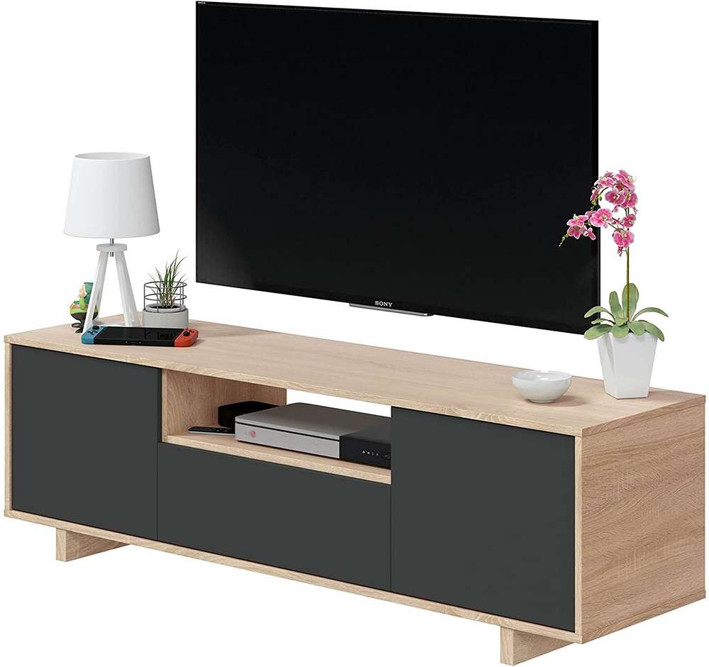 Tiene un diseño muy decorativo y elegante, siendo ideal para poner tu televisor y ahorrarte espacio. Está fabricado en material aglomerado de alta calidad, lo que garantizará que durará por mucho tiempo. Además, tiene una gran capacidad de almacenaje, gracias a sus estantes y a su puerta extensible, para que mantengas todo en tu salón completamente ordenado.