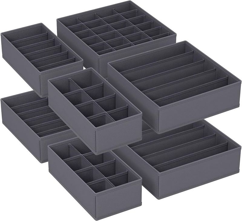 Se trata de un juego de 6 organizadores de cajones plegables, que tienen un buen tamaño para que puedas usarlos para almacenar todo lo que necesites. Tendrás 2 cajas de almacenamiento pequeñas, 2 medianas y 2 grandes, con la parte superior completamente abiertas, lo que hace que sean muy transpirables. Permiten ahorrar espacio cuando no se utilizan porque son completamente plegables, para facilitar el almacenamiento.