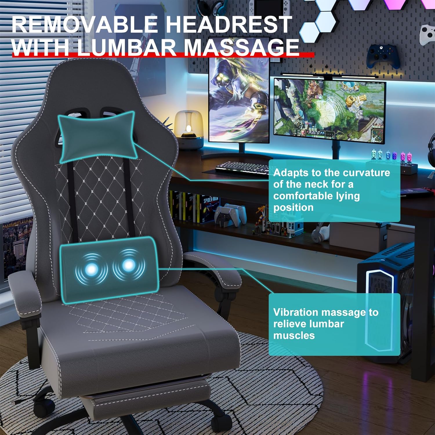 Diseño Ergonómico: El soporte lumbar de espuma viscoelástica y el reposacabezas extraíble están diseñados para proteger tu columna vertebral y cuello. ¡La comodidad es clave para concentrarte en ganar!