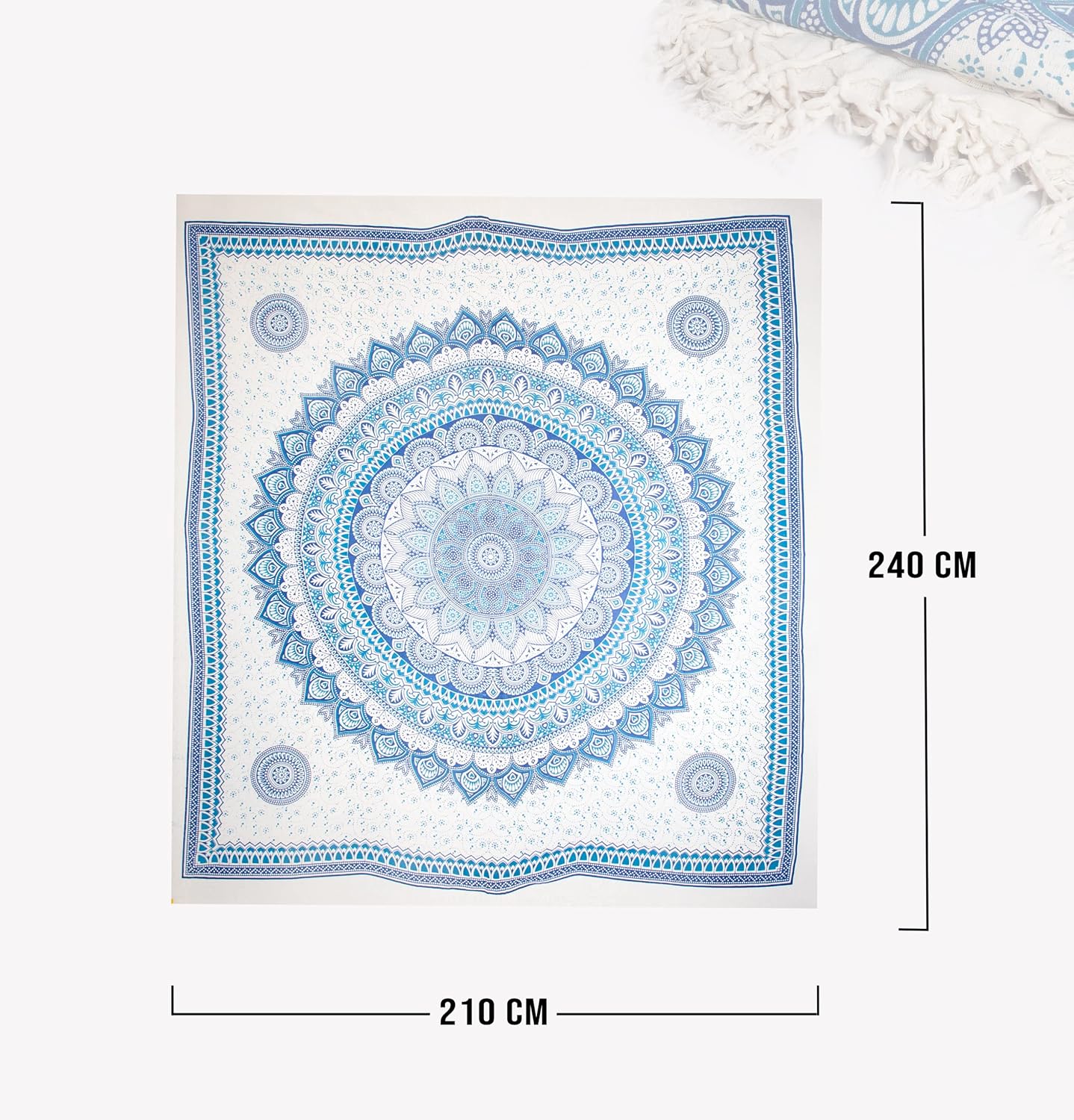 Fabricada al 100% en algodón de alta calidad, combina suavidad, durabilidad y una excelente capacidad de absorción y transpirabilidad, manteniéndote fresco incluso en los días más calurosos. Su diseño bohemio con motivos mandala en tonos azules y otros colores vivos aporta un toque moderno y alegre a tu equipaje.