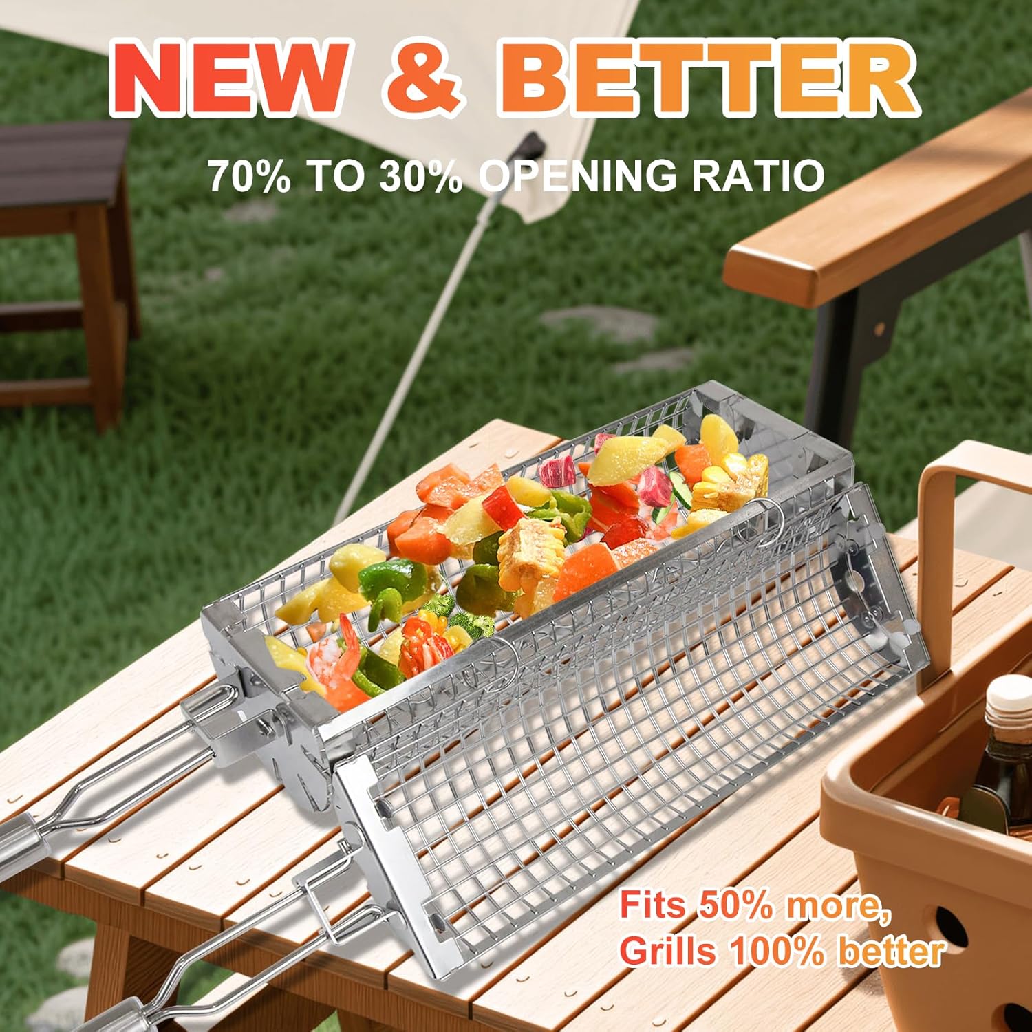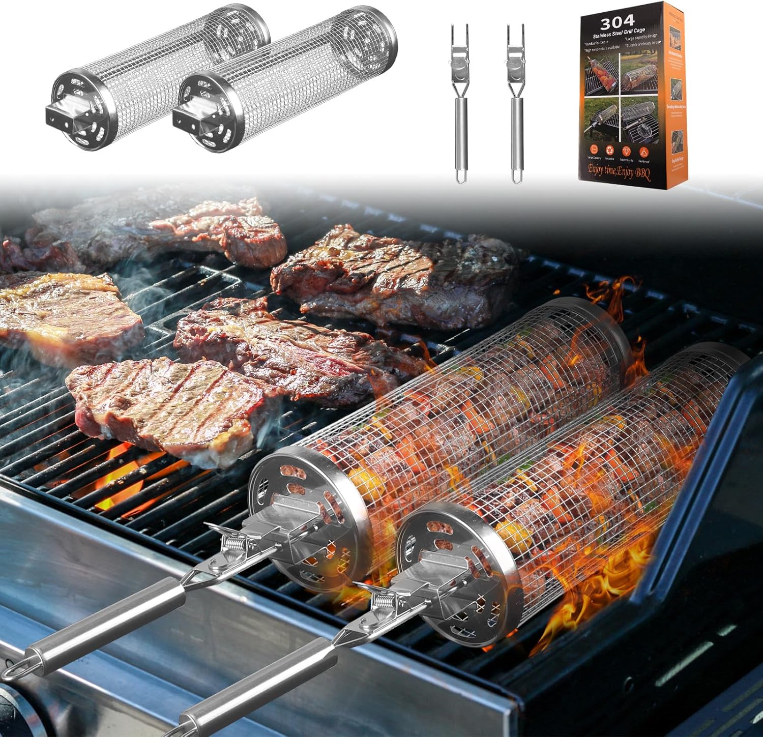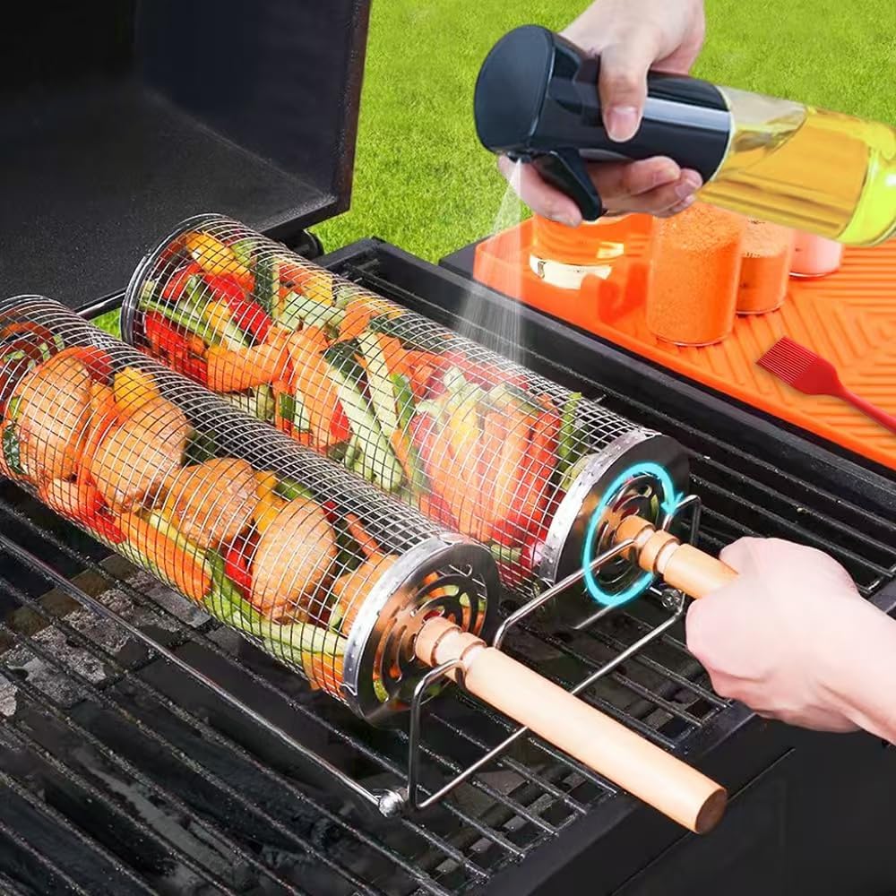 Descubre la parrilla rodante más versátil: un cilindro de malla de acero inoxidable 304 que gira suavemente sobre el fuego, mezclando y asando verduras, patatas, mariscos o incluso frutas y albóndigas al mismo tiempo. Perfecta para barbacoas al aire libre, acampadas y reuniones familiares.