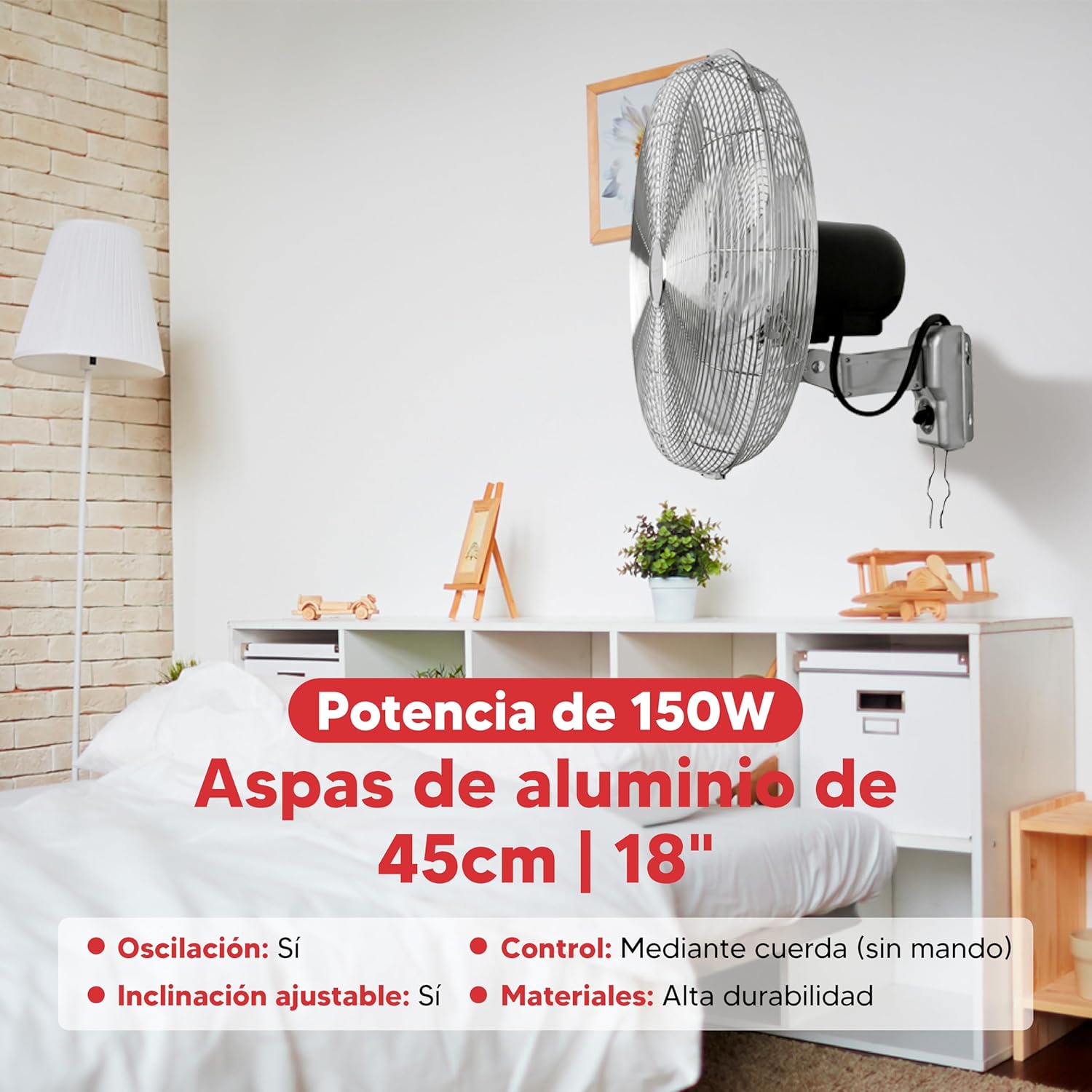 Con 150W de potencia real, aspas de aluminio, estructura metálica reforzada y un sistema de oscilación automática, este ventilador mueve el aire de forma agresiva pero controlada, refrescando tu entorno en segundos. Y todo esto, montado cómodamente en la pared para que el espacio quede libre y el flujo de aire sea óptimo.