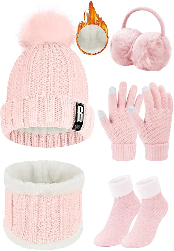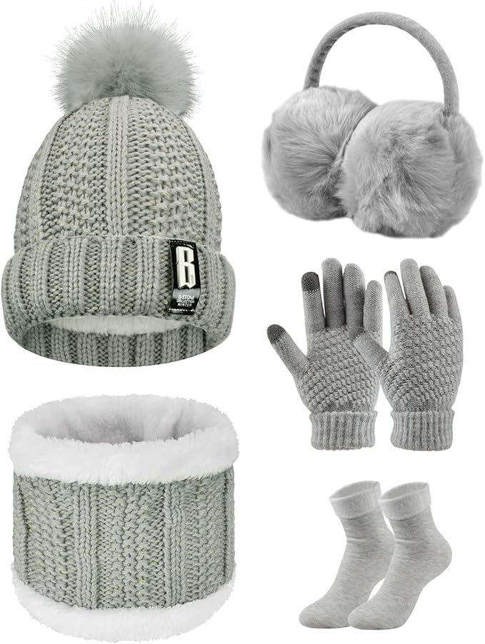 Juego de Invierno de 5 Piezas: Este conjunto incluye 1 bufanda de bucle de invierno, 1 gorro de punto, 1 par de orejeras de felpa, 1 par de guantes y 1 par de calcetines gruesos. Todos los elementos son cálidos, suaves y no pican, ofreciendo moda, generosidad y comodidad durante todo el invierno. ¡Perfecto para complementar cualquier atuendo invernal!
