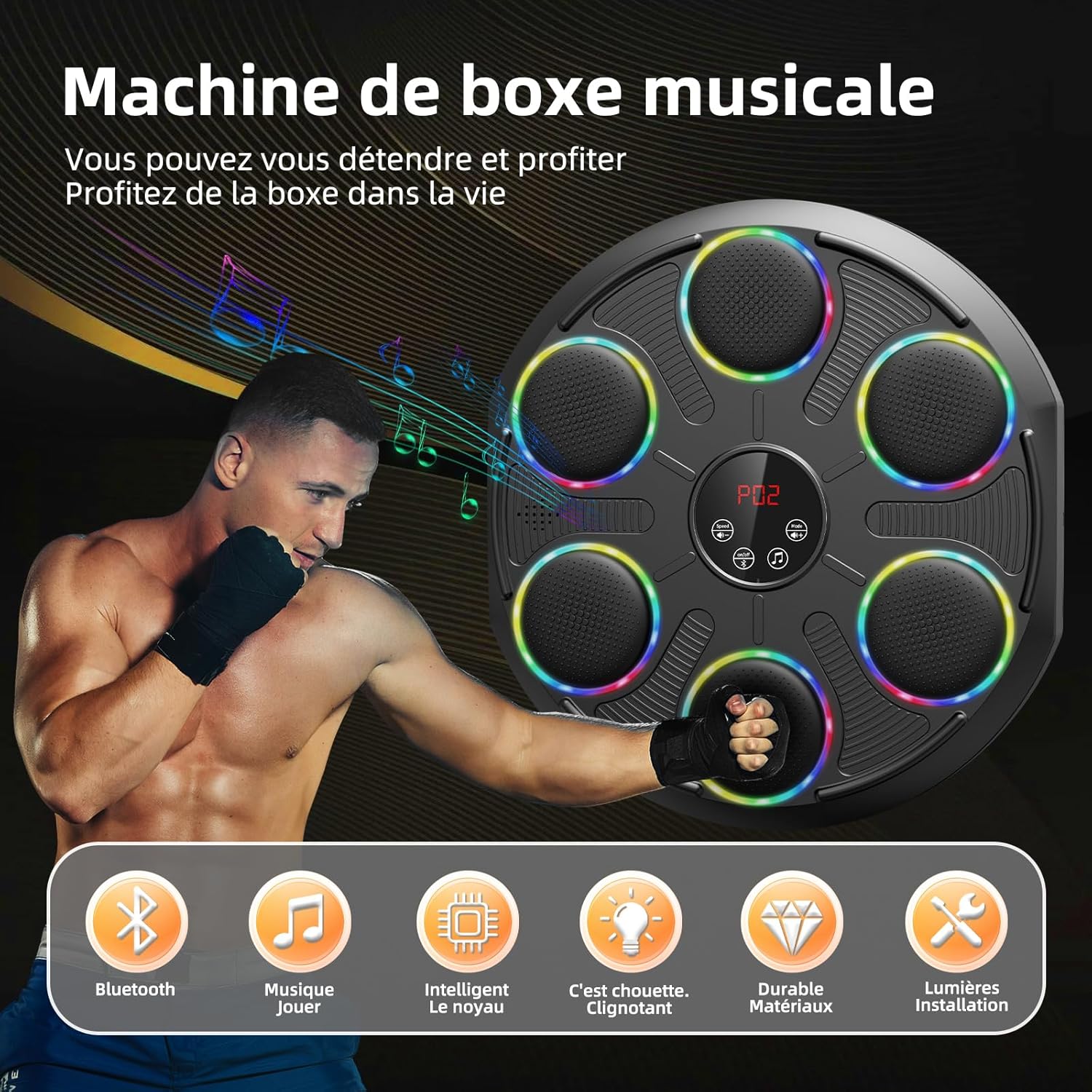Esta innovadora máquina de boxeo cuenta con altavoces mejorados y sonido envolvente, permitiéndote conectar tu música favorita por Bluetooth. Las luces LED se sincronizan con el ritmo, creando un entrenamiento emocionante y motivador.