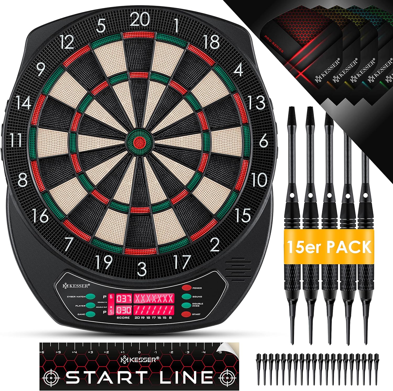 Cuenta con un ordenador integrado en la diana, que te ofrecerá 38 posibilidades de juego diferentes con muchas variantes. Tiene cuatro niveles de dificultad para asegurar la máxima diversión tanto para principiantes o para expertos. La pantalla LED permite regular el volumen, y viene con un total de 100 puntas suaves de recambio. Viene con un adaptador de corriente y una cinta adhesiva para la línea de tiro.