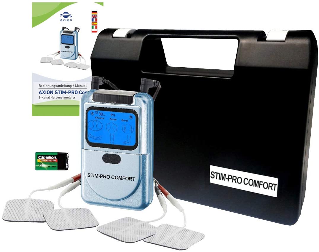 Con un precio accesible, el electroestimulador Tens Stim PRO Comfort de Axion tiene dos canales y funciona a través de nueve programas. Todos estos se encargan de mejorar el dolor muscular, de espalda, rodilla, cuello, artrosis, artritis y articulaciones. Incluye, además, sesiones de rehabilitación y masaje para mejorar las zonas deseadas. Es un aparato fácil de usar, ideal para principiantes gracias a su cómodo uso. Tan solo se requiere escoger el programa deseado, identificar la intensidad y el equipo comienza a trabajar.