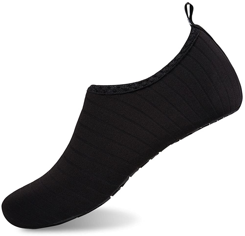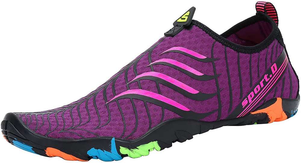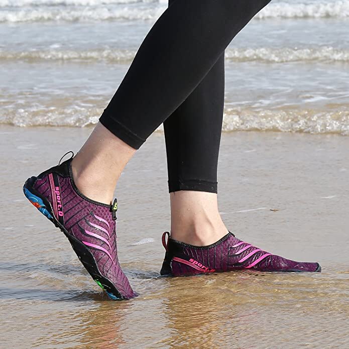 Si estás buscando unos escarpines para la playa baratos, no cabe duda de que estos serán una muy buena opción para ti. Esto debido a que son completamente transpirables y de secado rápido, ofreciendo la sensación de llevar puestos unos calcetines. Su suela está fabricada en goma gruesa antideslizante, lo que te protegerá por completo contra los resbalones, y cuentan con una resistente lengüeta en el talón lo que hace que sean fáciles de poner y quitar.