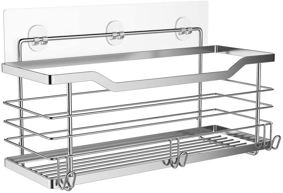 Se trata de un modelo muy útil que no tiene necesidad de taladrar, y que se fija mediante cinta autoadhesiva que no requiere perforación de las paredes. Su gancho adhesivo con ventosa es altamente firme, y permite que el estante pueda soportar un total de 20 kilos de peso, por lo que es ideal para cualquier espacio que lo necesites. Cuenta con una amplia capacidad, y en su parte inferior tiene dos ganchos para colgar toallas o bolas de baño.