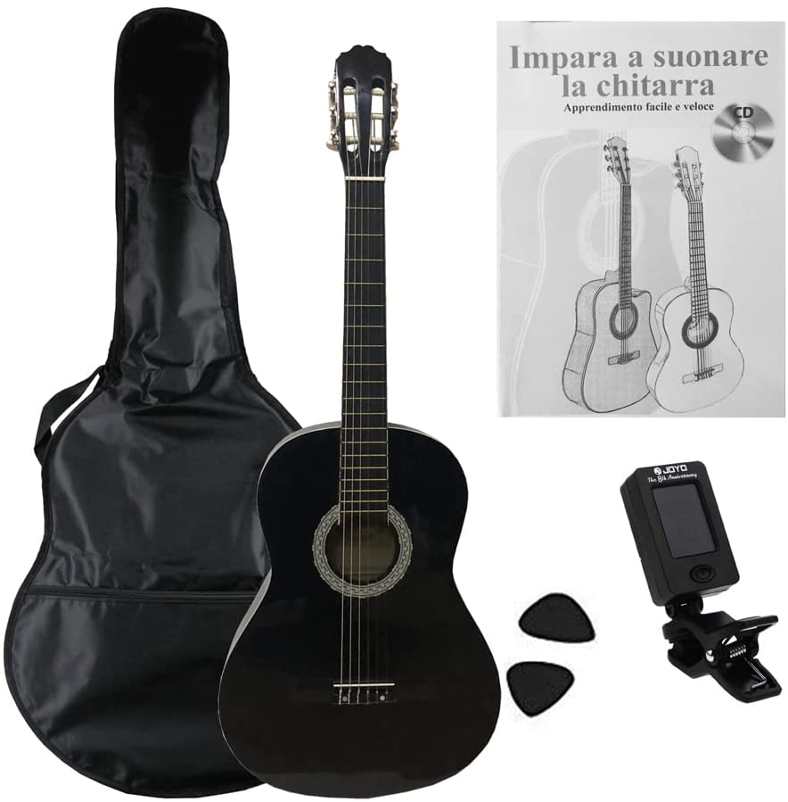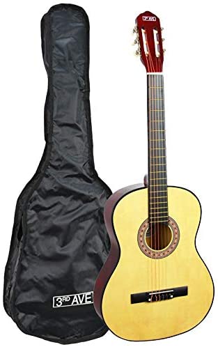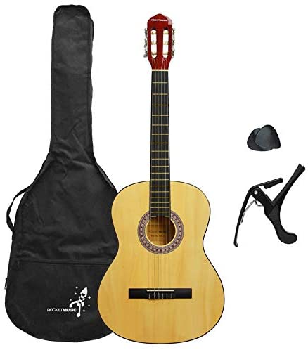 Este es un pack de guitarra para principiantes de muy buena calidad que incluye todo lo que necesitarás para aprender. La puedes encontrar tanto en tamaño para adultos 4/4 o en tamaños para niños dependiendo de lo que necesites. Esta guitarra está equipada con cuerdas de nailon que son más fáciles de pulsar, lo que las hace ideales para los principiantes.
