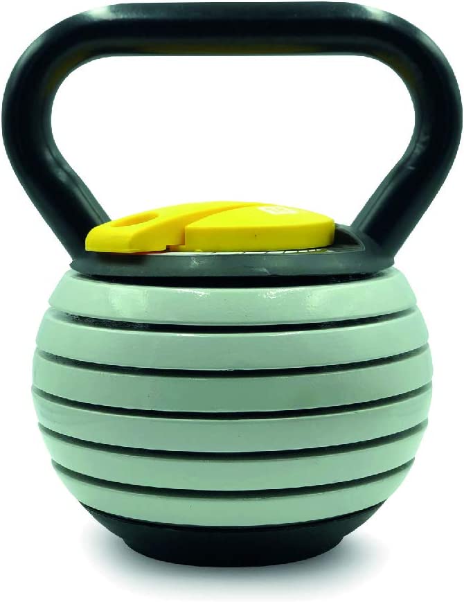 Esta es una Kettlebell que es completamente ajustable, en la que puedes seleccionar una con ajuste de 8 a 16KG o de 16 a 24KG. Viene con un inteligente mecanismo que permite seleccionar y fijar las placas de pesas. Ofrece múltiples posibilidades de entrenamiento de fuerza y resistencia, sustituyendo un total de hasta cinco pesas individuales.