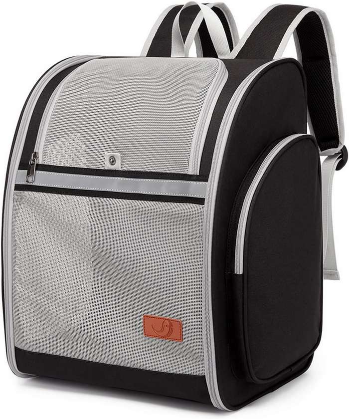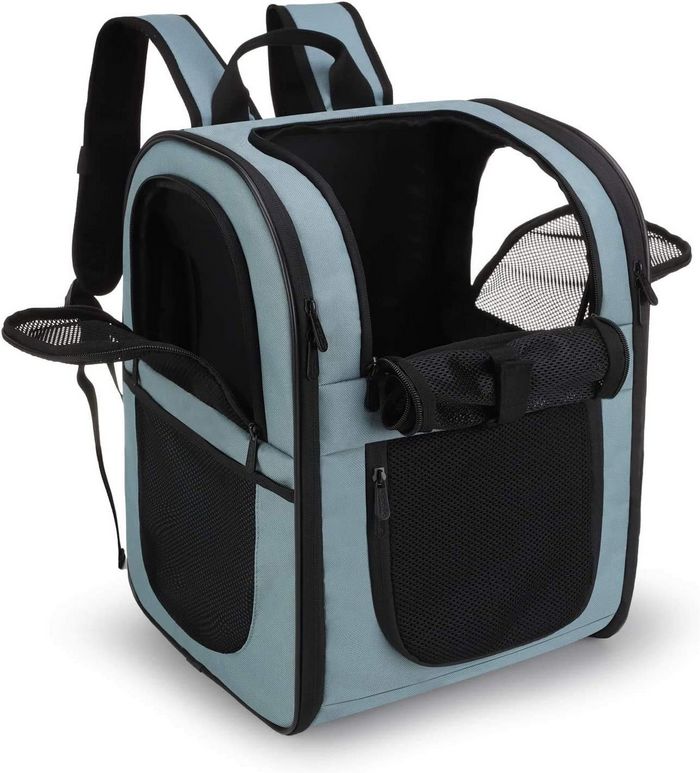 Se trata de una mochila para perros que tiene una excelente relación calidad-precio, y que está fabricada con tela Oxford catiónica de 300D. Tiene un marco sólido en alambre de acero para garantizar su estabilidad y que no se vaya a colapsar. Su fondo tiene una cubierta de tela extraíble, que es de felpa corta por un lado y de tela transpirable por el otro. Soporta mascotas de hasta 8KG de una forma sencilla.