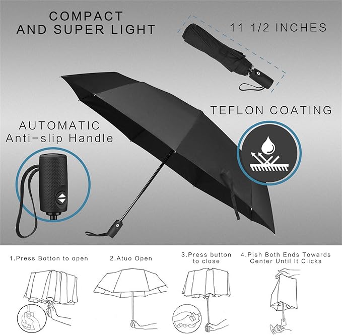 Cuando está cerrado medirá solo 33cm, y pesa menos de 0,5KG, logrando de esta forma el equilibrio perfecto entre el tamaño y la maniobrabilidad. Sus varillas son altamente resistentes, y está fabricado con tejido de teflón 210T, que es extremadamente impermeable, para las condiciones climáticas extremas. Cuenta con una garantía de 3 años, y cuenta con un sistema de apertura/cierre automático.