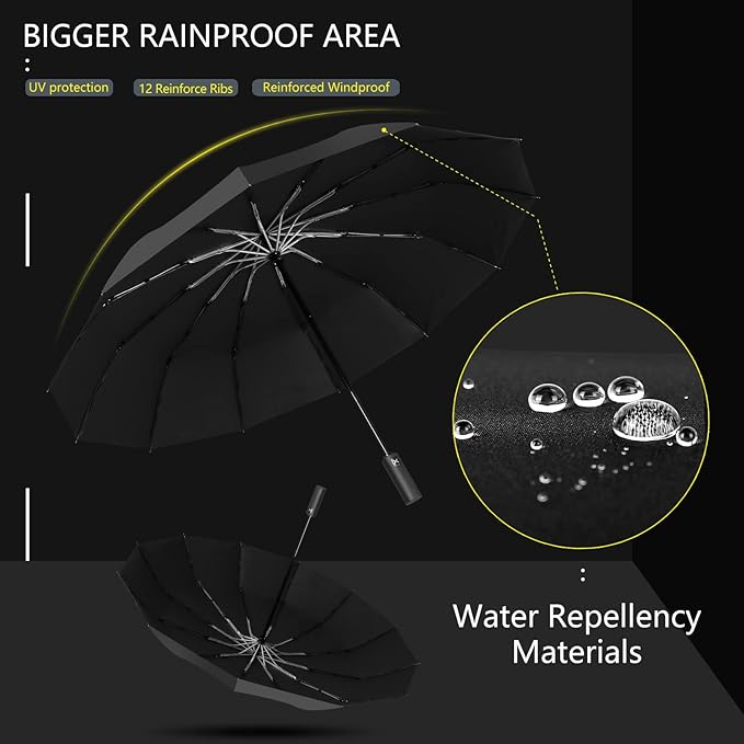 Se trata de un paraguas de bolsillo que es resistente a los vientos fuertes, ya que cuenta con 12 varillas de fibra de vidrio reforzadas. Esto hace que el paraguas no se rompa, y si el viento es demasiado fuerte simplemente se da la vuelta. Además este paraguas cuenta con la máxima calificación UPF alcanzable: UPF 50+, lo que significa que bloquea eficazmente el 99% de la radiación ultravioleta incluso cuando el sol es fuerte.