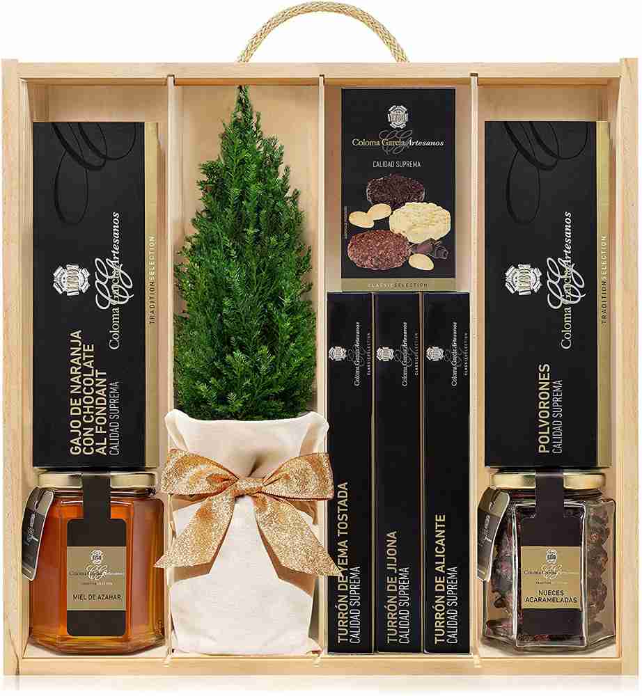 Este es un muy bonito regalo para la época navideña, porque incluye Miel de azahar, gajos de naranja, rocas de chocolate artesanales con almendras, turrón artesano, nueces acarameladas, polvorones artesanales, así como un árbol de navidad. Es una caja bastante completa que permitirá hacer un regalo muy especial y que en la elaboración de todos sus productos utilizan materias primas de primera calidad.