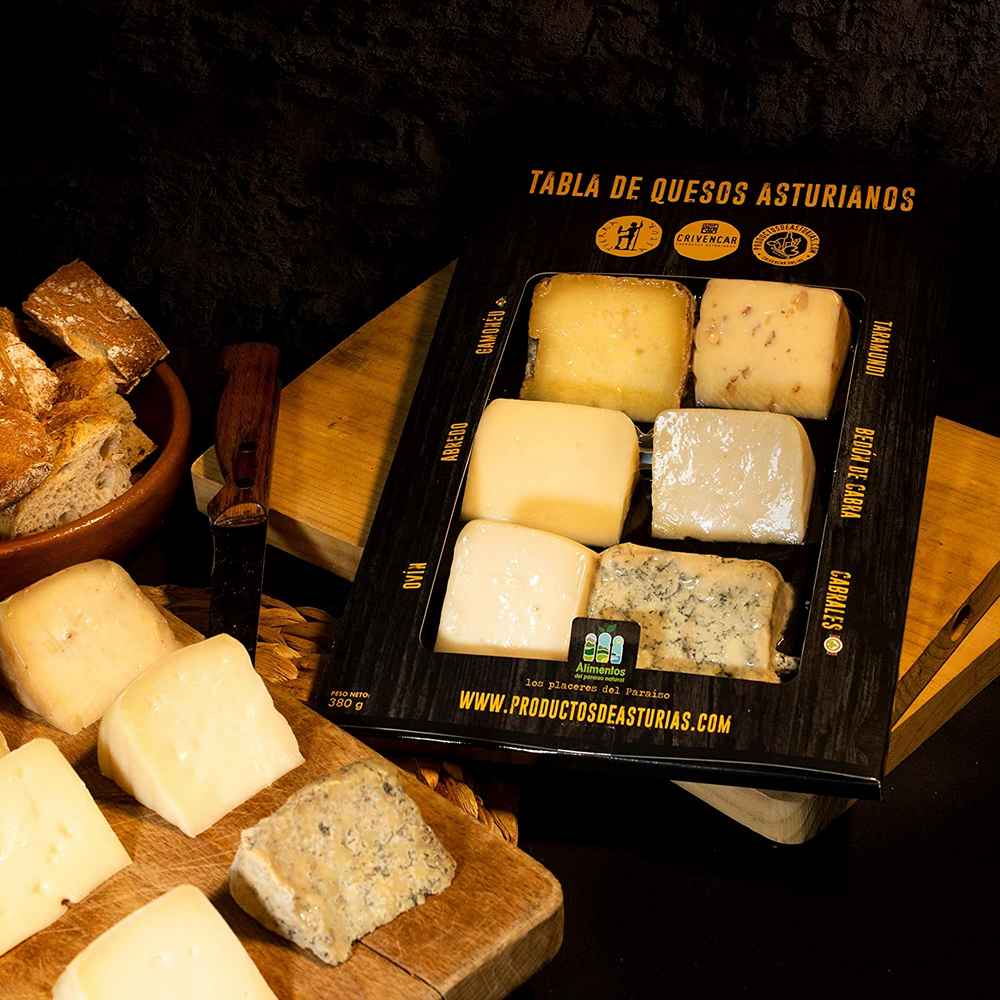 En esta tabla te encontrarás con una gran variedad de quesos los cuales son: Cabrales DOP, Gamonéu DOP, Abredo, Ovín, Taramundi y Bedón de Cabra. Gracias a su práctico embalaje es perfecta para regalar en cualquier ocasión. Para su consumo se aconseja sacar de su empaque original, y del frigorífico con media hora de anticipación, arpa que puedan expandir su aroma y sabor.