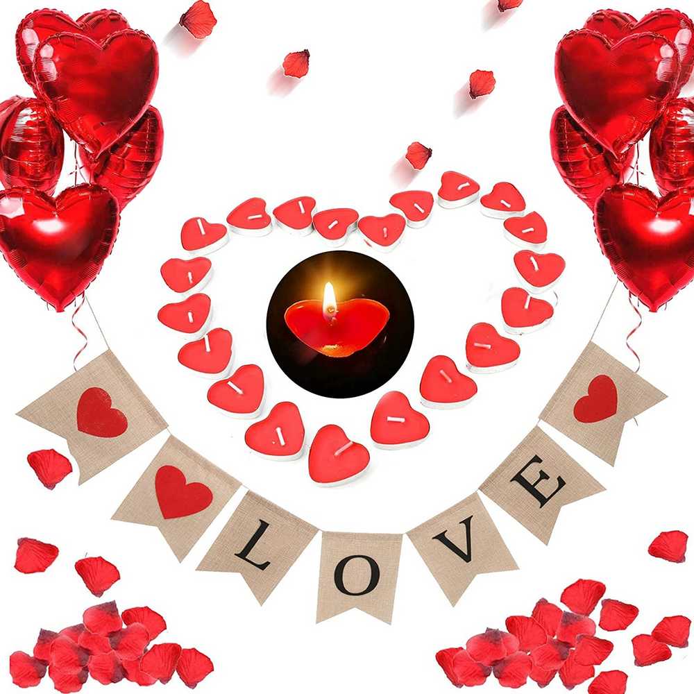 Este es un set romántico que puede hacer que la cena de San Valentín sea mucho más especial gracias a la decoración romántica. Tiene una pancarta, 1000 pétalos de rosa, 50 velas de té en forma de corazón y 10 globos en forma de corazón. Este es un juego de decoración que te permitirá tener una fiesta única y lujosa para el día de San Valentín. Los pétalos de rosa están hechos en poliéster de alta calidad con un diseño muy realista.