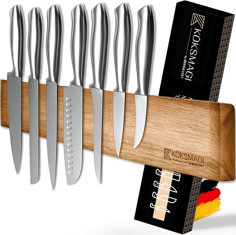 Es un modelo de soporte magnético para cuchillos que es una alternativa al bloque de cuchillos y que permite ahorrar mucho espacio. Esta barra está fabricada en madera de acacia de alta calidad, siendo apta para alimentos y es muy fácil de limpiar. En su interior cuenta con imanes de ferrita extrafuertes, que hace que los cuchillos se mantengan en su lugar incluso si son pesados y grandes. Las dimensiones que tiene esta barra para cuchillos son de 50x6x1,9cm.