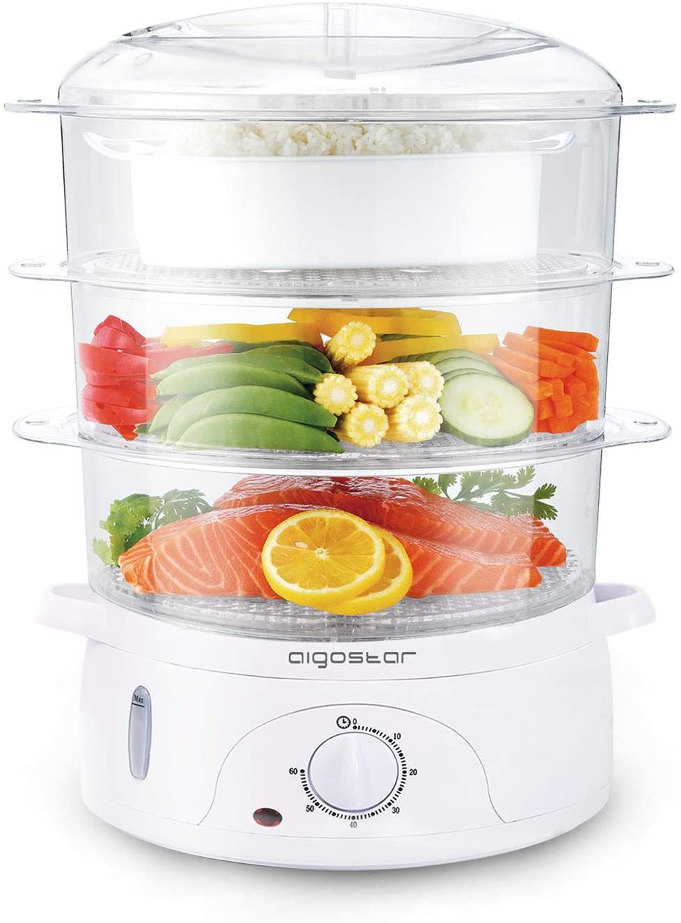 Sus tres recipientes transparentes apilables tienen una capacidad de 3 litros cada uno, lo que hace que puedas cocinar una buena cantidad de alimentos. Para facilitar la limpieza, todos los recipientes se pueden colocar en el lavavajillas para una limpieza más fácil. También ofrece un indicador de nivel de agua con una gran visibilidad, para que puedas saber cuándo necesita más agua que se puede colocar por sus dos entradas laterales.