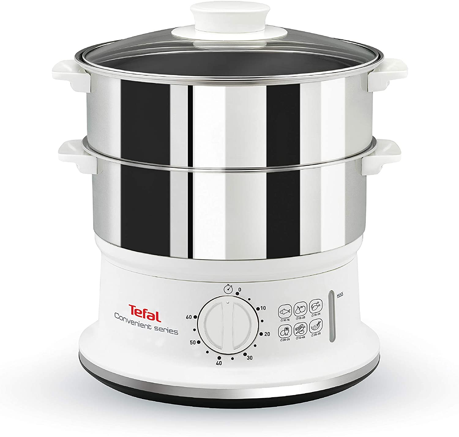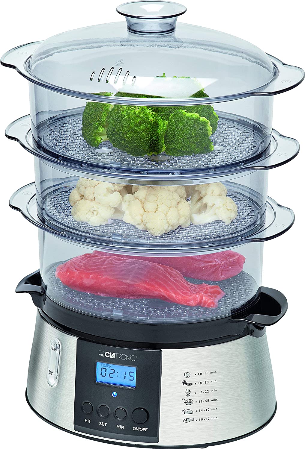 Todos sus recipientes plásticos están completamente libres de BPA, para garantizar que no desprenderán químicos tóxicos en tu comida. Su temporizador de 60 minutos permite graduar el tiempo de cocción de una forma muy fácil. Tiene entradas laterales de agua para que se pueda facilitar el rellenado durante la cocción, y un indicador del nivel de agua para tener un mayor control sobre el agua disponible. Ofrece un recolector de jugos lo que permite que sea mucho más fácil la limpieza.